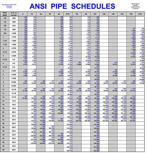 Find an ANSI pipe schedule from Crestwood Tubulars, a pipe distributor. Use our ANSI Pipe Chart to determine the nominal pipe size, wall thickness, weight and schedule designations. Charts include: Pipe Size to Pipe Schedule Chart, Paddle Blind Hydrotest Thickness Chart, BWG Tube Gauge Chart, and more. Dimensions, weight and thickness of pipes schedule Pipes schedule chart, dimensions, weight and pipe wall thickness Register Forgot password.