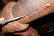 Cast iron used to be used in a number of applications, including both for main water lines as well as for sewer lines. Cast iron pipe will sometimes crack at its weakest point, usually on the top or in a seam. Cast iron pipes used for waste piping, however, are subject to corrosive action that pipes carrying drinking water are not. Check for a crack if patches or streaks of rust are.