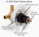 Kohler The Rite-Temp valve platform uses the latest pressure-balancing technology to provide anti-scald protection and temperature control for enhanced showering. Thermostatic Valve with Integrated Volume Control and Stops. Note: The K-3Rite-Temp Diverter Valve features a smooth diverter stem. And Pressure Balancing Unit Replacement Parts and Temperature Adjustment.